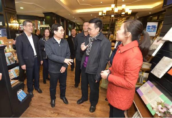 12月8日下午,中宣部副部长、国家新闻出版广电总局局长、中央电视台台长聂辰席一行到新华文轩出版传媒股份有限公司旗下轩客会书店·镗钯街店考察调研。四川省副省长朱鹤新、省政府副秘书长何旅章,四川省委宣传部副部长傅思泉,四川省新闻出版广电局局长邹吉祥、副局长张晓杰,四川新华发行集团董事长朱丹枫,新华文轩出版传媒股份有限公司董事长何志勇等陪同调研。