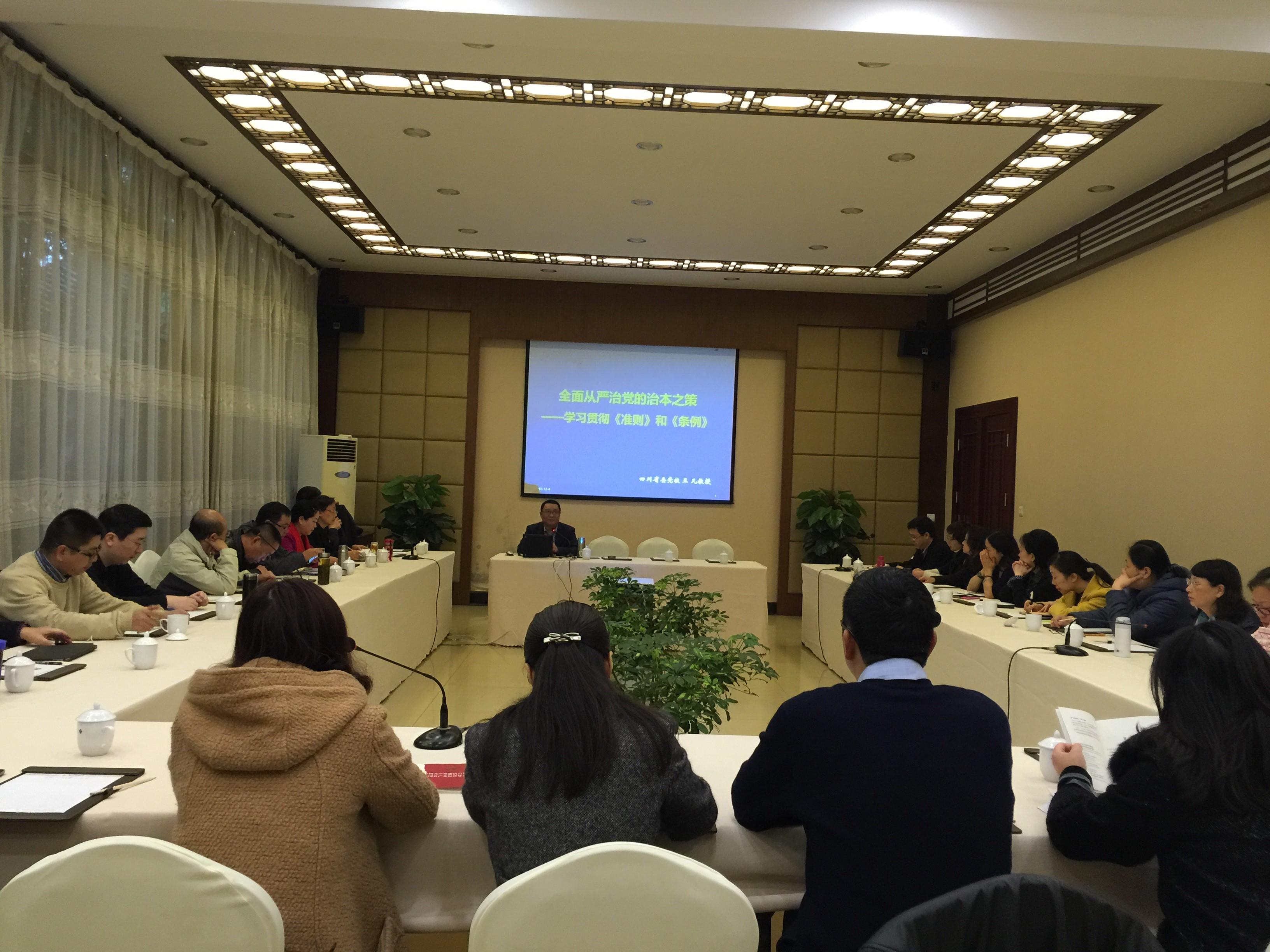 会议由公司纪检监察室主任王江川同志主持。首先由四川省委党校王凡教授作“全面从严治党的治本之策——学习贯彻《准则》和《条例》”专题讲座。王教授从《准则》《条例》修订的重要意义、修订的基本特点、修订的主要内容三个方面对新修订的《准则》《条例》作了深入、细致、全面的解读。与会人员对王教授的讲课反响非常好,都表示听了讲座后对自己更好地学习、理解、掌握、贯彻《准则》《条例》有很大的帮助。