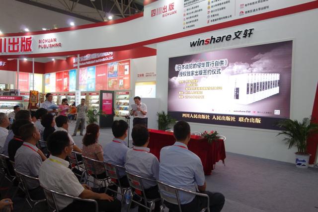 下午2点,中央档案馆、人民出版社、四川人民出版社就《日本战犯的侵华罪行自供》一书举行出版签约仪式在四川展馆举行。该书由中央档案馆唯一授权,人民出版社与四川人民出版社联合出版。国家新闻出版广电总局副局长吴尚之、中宣部出版局副局长刘建生、四川省委宣传部副部长朱丹枫新华文轩出版传媒股份有限公司董事长龚次敏、总经理杨杪、总编辑张京、副总经理陈大利出席了签约仪式。