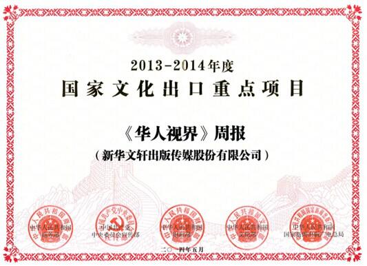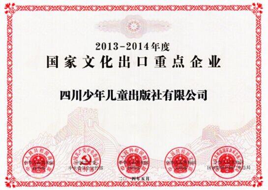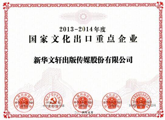 8月8日,在省商务厅举办的四川省服务贸易暨文化贸易培训会上,新华文轩出版传媒股份有限公司与旗下四川少年儿童出版社有限公司荣获商务部、中央宣传部、财政部、文化部、国家新闻出版总局联合颁发的“2013-2014年度国家文化出口重点企业”证书,这是新华文轩出版传媒股份有限公司与四川少年儿童出版社有限公司继2011-2102年度被认定为国家文化出口重点企业之后,再度获此荣誉。同时,新华文轩出版传媒股份有限公司在美国华盛顿文化拓展项目《华人视界》周报,也获得了商务部、中央宣传部、财政部、文化部、国家新闻出版总局联合颁发的“2013-2014年度国家文化出口重点项目”证书。