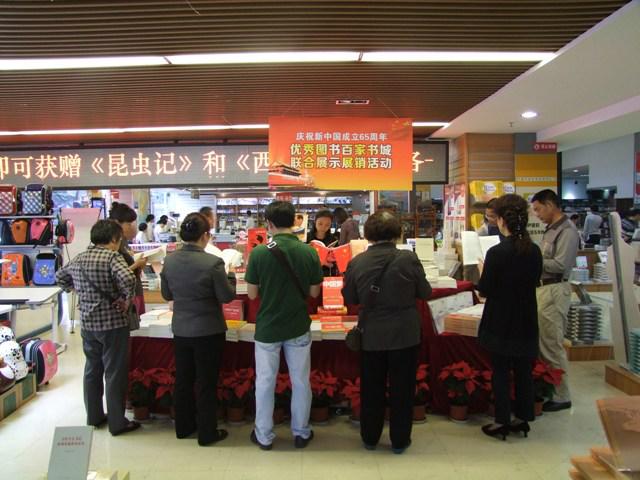 两个书城都在显著位置设立了联展专区,集中展示展销优秀图书共115个品种,统一悬挂了“庆祝新中国成立65周年优秀图书百家书城联合展示展销活动”的横幅,并用LED滚动播放庆祝新中国成立65周年图书联展的相关信息。