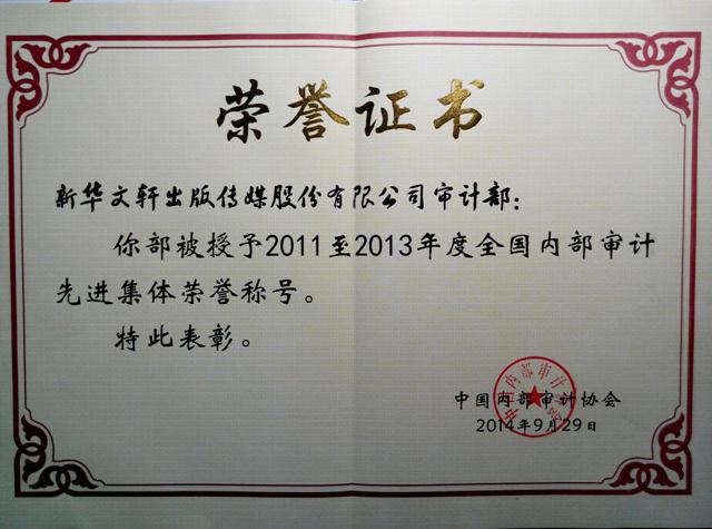 本次大会共从全国6.6万个内审机构中选出了292个“全国内部审计先进集体”,新华文轩出版传媒股份有限公司审计部是四川省获此殊荣的六家单位之一。公司总法律顾问黎坚出席会议并领取了奖牌。“全国内部审计先进集体”也是国家“清理规范评比达标表彰工作联席会议”于2009年在撤销评比达标表彰项目70461个,保留行政等系统中央单位项目377个中内部审计行业唯一一个全国性奖项。