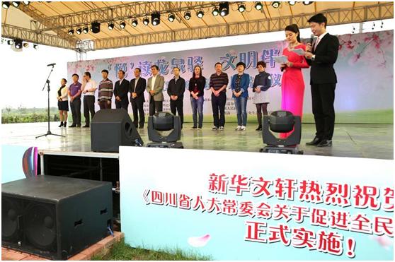 4月22日上午,新津县2016年世界读书日暨全民阅读活动启动仪式在新津县西河故道湿地公园举行,文轩是此次活动的承办单位之一。活动仪式上“百溪书院•文轩读读书吧”也正式投入运营,该书吧位于百溪碧流涌动、绿树翠竹掩映的西河故道百溪堰上,被当地群众誉为最美社区书屋。未来3年,文轩将按照成都市“一街一书屋”公共文化服务项目的部署,在成都建设100个“文轩读读书吧”,为市民提供“休闲漫步能阅读,提着菜篮子逛书店”的便捷文化服务,解决公共文化服务“最后一公里”难题。