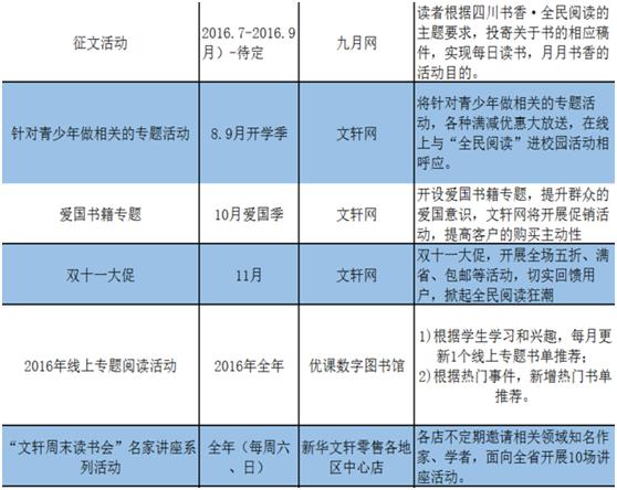 新华文轩出版传媒股份有限公司(以下简称“文轩”)作为出版传媒企业,长期以来坚持举办各类阅读推广活动,为我省全民阅读率的提高作出了应有的贡献。在世界读书日来临之际,文轩作为“书香天府”全民阅读活动的主要承办单位之一,在四川省全民阅读活动指导委员会办公室的指导下,以“七进”(进农村、进社区、进家庭、进学校、进机关、进企业、进军营)为主线,发挥文化传播主阵地、出版主力军和发行主渠道的优势,调动公司相关业务资源,以线上线下相结合的方式,组织策划了一系列阅读文化活动(见附件一:“书香天府”2016文轩全民阅读主要活动),营造“随意阅读、快乐阅读、享受阅读”的氛围,进一步打造“书香天府”全民阅读活动品牌,提高公民思想道德修养和科学文化素质,为“书香天府”全民阅读活动的开展做实内容、增添亮色。