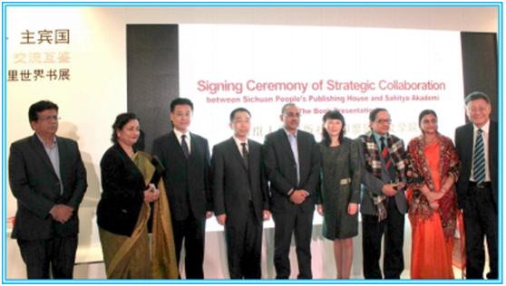 一是“四川人民出版社与印度国家文学院战略合作协议签约暨赠书仪式”。国家新闻出版广电总局综合业务司副司长丁以绣、中国驻印度大使馆政务参赞孙戈、印度国家文学院执行秘书长K•Sreenivasarao、印度OM国际出版公司总裁奥姆•普卡拉什•马戈、四川新华发行集团董事长朱丹枫、文轩副总经理安庆国等嘉宾和中印媒体出席了本次活动。丁以绣副司长在致辞中表示,本次签约是中印文化机构一次具有重要社会价值和历史意义的合作,将对共建两国文化大局播下友谊的种子。印度国家文学院执行秘书长K•Sreenivasarao博士表示,作为印度的最重要的文学机构,印度文学院非常荣幸能与四川人民出版社合作,随着双方加强互动,必能促进中印文化交流。文轩副总经理安庆国表示,这是一次强强联合,增进两国人民文化交流的一次重要实践,具有一定的开创意义。随后四川人民出版社副总编辑周颖与印度国家文学院执行秘书长K•Sreenivasarao博士签署了战略合作协议。