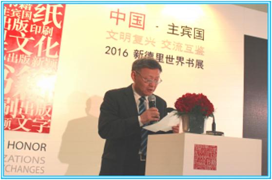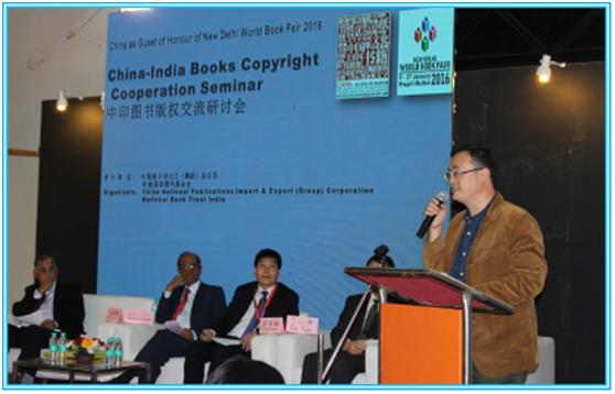1月11日下午,在新德里世界书展中国主宾国活动区的举办了以“中印图书出版版权合作”为主题的中印图书版权交流研讨会上,国家新闻出版广电总局综合业务司副司长丁以绣、四川美术出版社社长马晓峰、外语教学与研究出版社综合语种分社社长彭冬林、印度DK Agencies总裁Mr.Ramesh Mittal、印度出版商联合会主席Mr.Ashok Gupta等中印出版界代表参与研讨会并作主题发言。