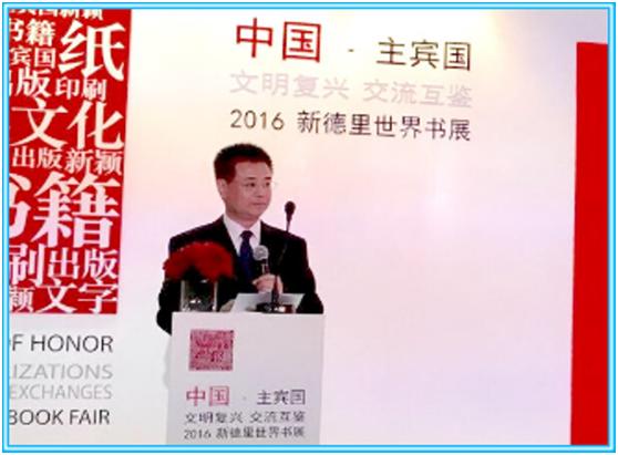 2016年1月6日至1月11日,在四川新华发行集团董事长朱丹枫和新华文轩出版传媒股份有限公司副总经理安庆国带领下,集团及文轩组团参加了印度“2016新德里世界书展”。在参展人员的共同努力下,文轩承办的各项中国主宾国活动取得圆满成功。国家新闻出版广电总局副局长孙寿山、中国驻印度大使乐玉成、印度东北地区发展部部长吉坦德拉•辛格、社会公正和赋权部国务部长克里山•帕尔•古尔加尔等中印政要出席了“《草根总理——莫迪》(中文版)图书发布会”等重要活动并发表讲话。各参展出版社版贸工作取得良好成绩,共签订版权输出项目18种,输出意向6种,引进项目3种,合计27项。经过多次洽谈,文轩与印度OM出版公司签订合作备忘录,商定了进一步推进合作的事项。各单位参展人员与印度出版机构、印度文化界人士和一些印度高级官员进行了交流,充分展示了文轩的实力和形象,拓展了合作的渠道,取得了丰硕的成果。文轩是各出版集团中举办中国主宾国活动最多的集团,所组织的中国主宾国活动也是在本次书展中影响最大的。