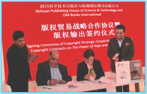 二是四川科学技术出版社与印度OM国际图书公司在中国主宾国展区联合举行的“版权贸易战略合作协议暨《中国滋味——西式厨艺烹川菜》和《瑜伽的力量》版权输出签约仪式”。四川新华发行集团董事长朱丹枫、文轩副总经理安庆国,印度OM国际图书公司总裁奥姆•普拉卡什•马戈、CEO桑杰伊•马戈、阿杰伊•马戈等五位高管以及四川科技出版社社长钱丹凝等出席签约仪式。朱丹枫董事长在致辞中称赞中印两家出版公司版权贸易战略合作暨版权输出签约仪式的举行是中印文化交流的范例,中印出版界的合作前景广阔。钱丹凝社长和OM国际图书公司高管阿杰伊先生在讲话中表示,双方版权贸易战略合作暨版权输出协议的签订携手合作的良好开端,今后双方将会推动更深入和多方面的合作,共谋发展。