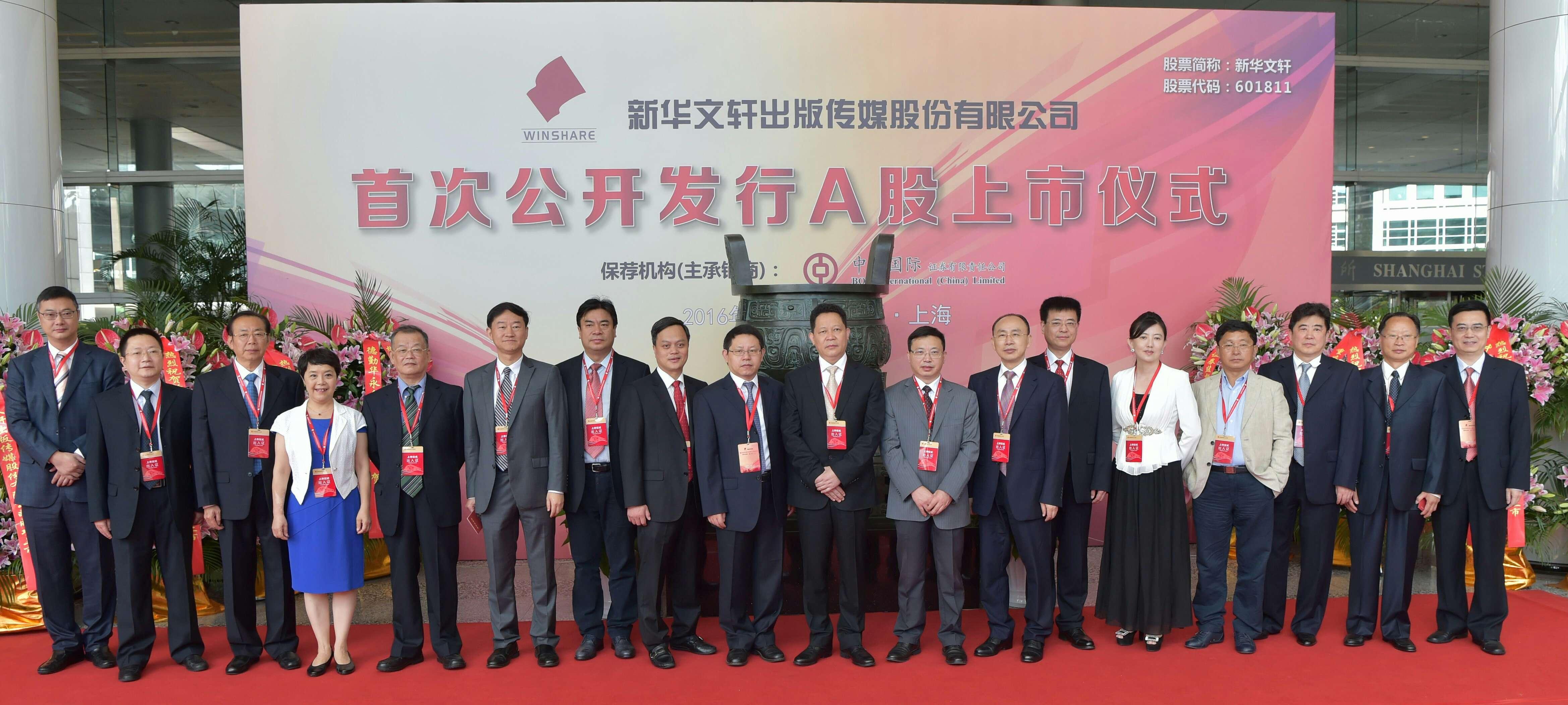 2016年8月8日,新华文轩出版传媒股份有限公司(以下简称“新华文轩”)首次公开发行A股上市仪式在上海证券交易所举行,这标志着新华文轩正式登陆A股,成为我国首家A+H两地上市的出版发行企业。出席新华文轩上市仪式的领导和嘉宾包括:四川省人民政府副省长杨兴平,国家新闻出版广电总局规划发展司司长朱伟峰,四川省新闻出版广电局党组书记、局长邹吉祥,中共四川省委宣传部副部长李晓骏,四川新华发行集团有限公司党委书记、董事长朱丹枫,四川出版集团有限责任公司党委书记、董事长罗勇,中银国际证券有限责任公司董事、执行总裁宁敏,著名文化学者、秋雨书院院长余秋雨,四川省作家协会主席阿来,四川省政府国有资产监督管理委员会副主任任丁,中国证券监督管理委员会四川监管局综合业务监管处处长周晓,四川出版集团有限责任公司前党委书记、管委会主任莫世行,四川新华发行集团有限公司前党委书记、董事长龚次敏,四川新华发行集团有限公司、新华文轩出版传媒股份有限公司前董事长王庆夫人沈晓翊,四川出版集团有限责任公司前党委书记、管委会主任张邦凯,四川新华发行集团有限公司前总裁戴川平,四川新华发行集团有限公司总裁、新华文轩出版传媒股份有限公司董事长何志勇,新华文轩出版传媒股份有限公司总经理杨杪。在上市仪式上,四川省人民政府副省长杨兴平,中银国际证券有限责任公司董事、执行总裁宁敏,四川新华发行集团有限公司总裁、新华文轩出版传媒股份有限公司董事长何志勇分别致辞。杨兴平、朱伟峰、朱丹枫、何志勇共同鸣锣,象征着新华文轩正式登陆A股。