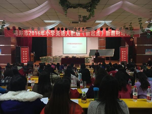 11月17-18日,绵阳市2016年小学英语人教版《新起点》新教材培训会召开,由绵阳市教育科学研究所主办,人民教育出版社、新华文轩出版传媒股份有限公司承办。培训特别邀请北京市特级英语教师马荣花、人民教育出版社编辑马茜、成都市英语教研员樊波、北京市海淀区英语学科骨干教师魏珊、成都市石笋街小学毛珊等教材专家和教师,在会上进行现场课及讲座。