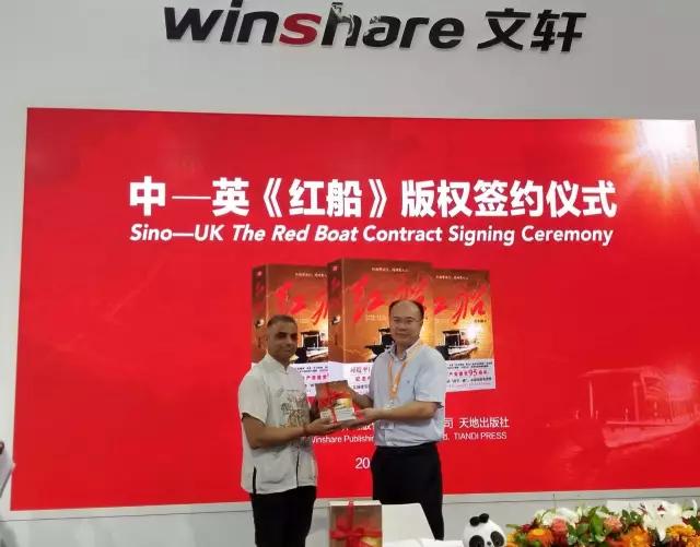 8月23日上午,新华文轩出版传媒股份有限公司及旗下天地出版社主办的“中—英《红船》版权签约仪式”在2017北京国际图书博览会四川展馆隆重举行。此次签约是为向全世界弘扬“红船精神”,推动《红船》走出去,同时献礼十九大,展现天地出版社在主题出版与主题出版物“走出去”方面的努力与决心。