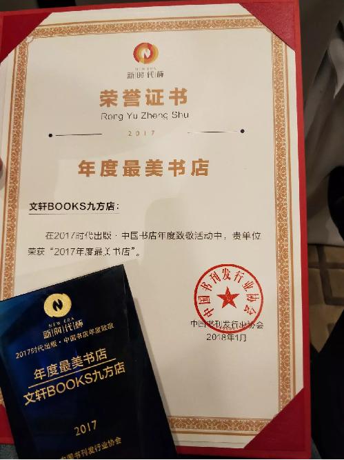 1月11日,由中国书刊发行业协会、百道网主办的“‘新时代杯’2017时代出版·中国书店致敬盛典”在北京举办。大会宣布了“致敬书店之都”、“致敬最美书店”、“致敬特色书店”等九大项目的致敬名单。新华文轩全新子品牌书店“文轩BOOKS”荣获“2017年度最美书店”称号。