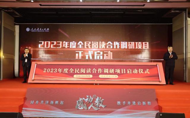 推进活动上,中国新闻出版传媒集团编委会主任、《中国新闻出版广电报》总编辑丁以绣与人教社党委书记、社长黄强共同启动2023年度全民阅读合作调研项目。活动现场还发布了人教社2023年度重点图书,包括:以《学党史树理想学生丛书》《中小学生国家安全教育丛书》为代表的主题出版物;以《快乐读书吧》《课文作家作品系列》《儿童分级阅读丛书》《中小学生阅读指导书系》为代表的课外阅读丛书;以《课堂笔记》《生命安全与健康教育》《必备古诗文系列》为代表的配套资源类图书;以《中国学前教育史料集成》为代表的学术图书;以《新编学生词典》《新编成语词典》为代表的学生使用工具书等。